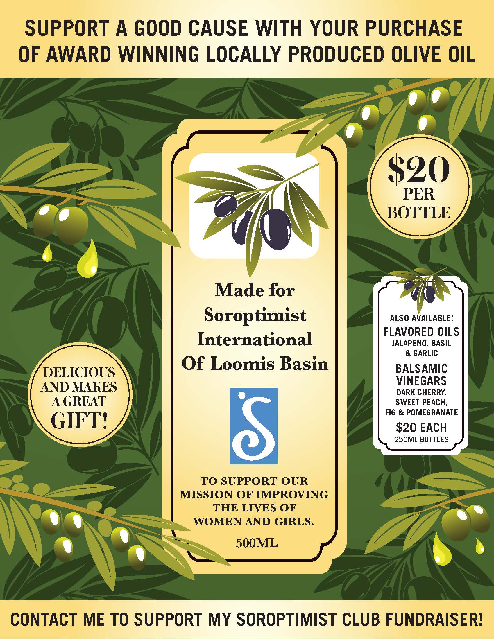 Our club is selling award winning Ternero olive oil made in Placer County so we can change the lives of women and girls. Ternero generously gives 50% of the proceeds of the co-labeled 500 ML olive oil bottles to our nonprofit global organization. Your support will make a difference in our community and abroad.