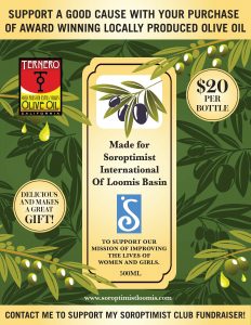 The Soroptimist International of Loomis Basin club is selling $20 500ML bottles of award winning Ternero olive oil made in Placer County so we can change the lives of women and girls. Ternero generously gives 50% of the proceeds to our nonprofit global organization. Your support will make a difference in our community and abroad.