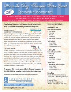 The Soroptimist International (SI) of Loomis Basin will host the popular It’s in the Bag designer purse fundraiser on Wednesday, January 18, 2023 from 6 to 8:30 p.m. (doors open at 5 p.m.) at the Blue Goose Event Center, 3550 Taylor Rd., Loomis. This “Ultimate Girl’s Night Out” supports education projects that lead to economic empowerment for women and girls.